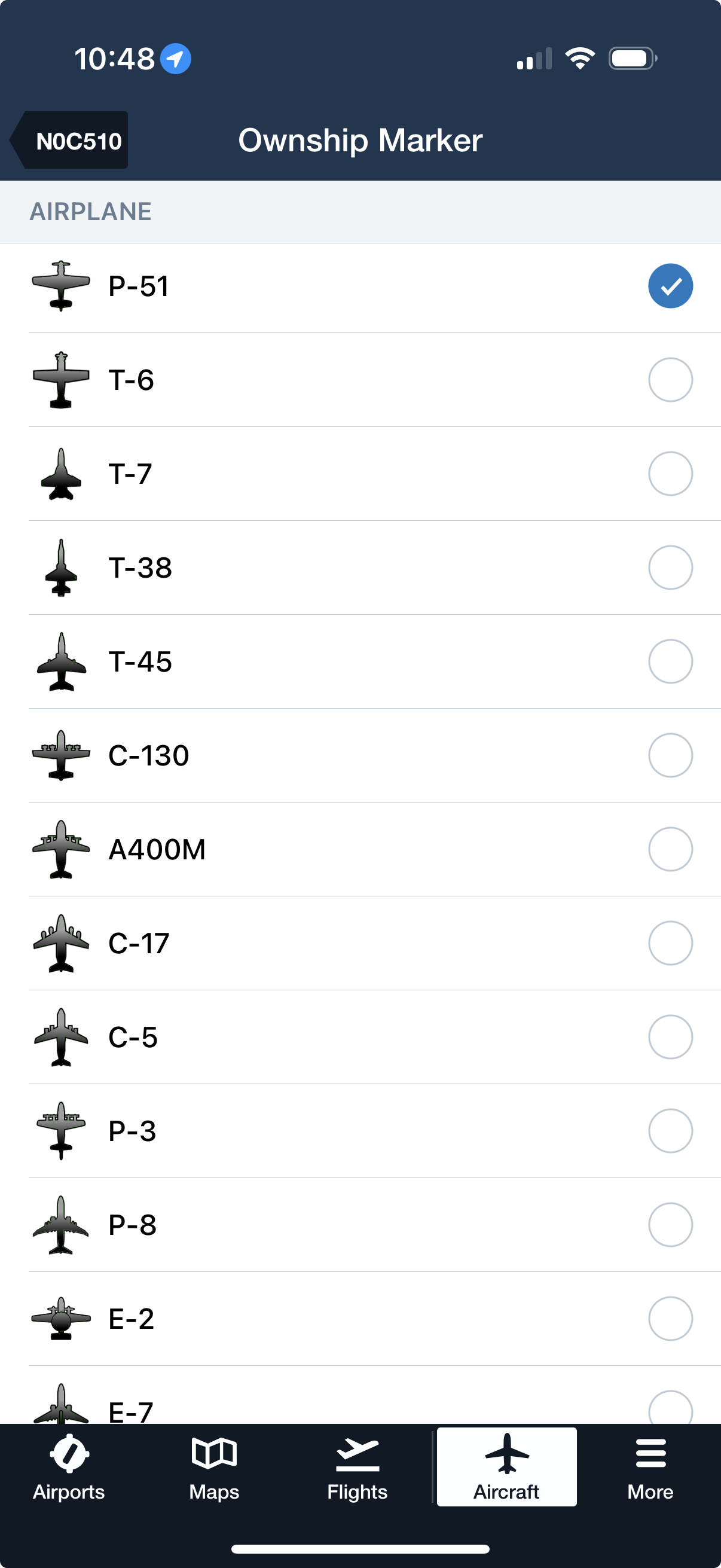 Differentiate your fleet at a glance by assigning each aircraft a unique icon and color. Navigate to More > Aircraft > Ownship Marker to create a custom look using dozens of current and historic aircraft models and a full range of colors. ForeFlight automatically displays the selected marker when that aircraft is selected in the FPL Editor on the Maps view.