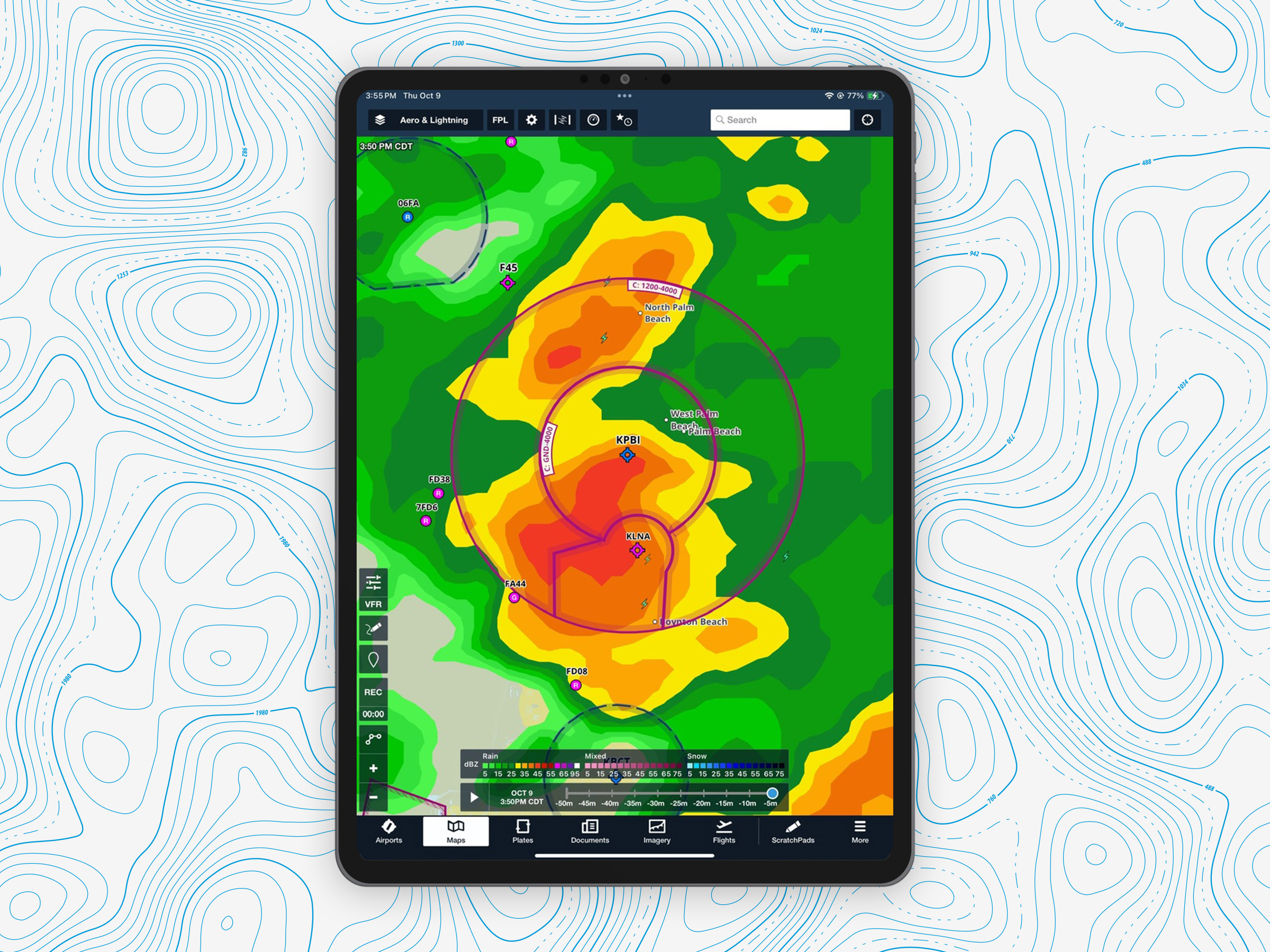 ForeFlight provides a helpful set of weather tools that let pilots see what’s happening in real time. The app pulls in the latest radar images, forecast data, and weather alerts that help you understand where thunderstorms are, how strong they are, and where they might be headed. As a TV Meteorologist I’ll even use these tools on my personal device when setting up my local forecast for the news. You can see high-resolution radar that shows active storm cells near your route or airport.