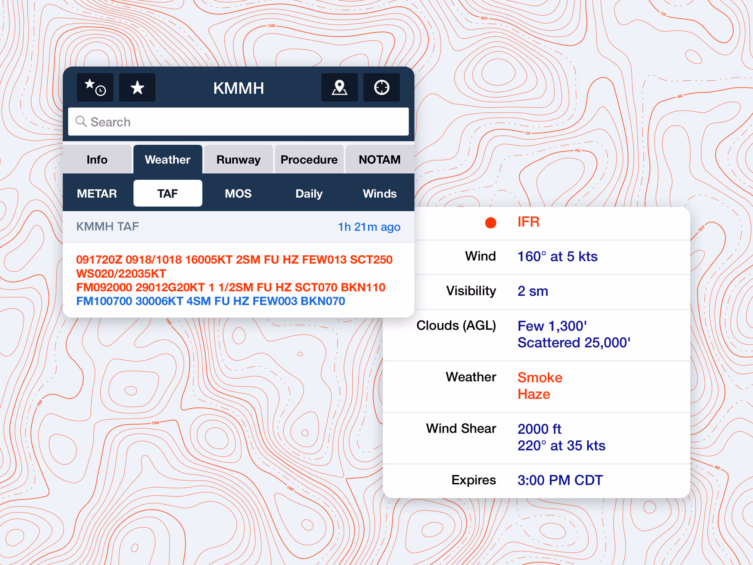 ForeFlight clearly highlights these notations and provides a simple translation with just a tap. It also summarizes the hourly TAF and displays wind shear in its own category in the hourly summary below the TAF. This takes the guesswork out of interpreting those coded messages we’ve discussed in the previous blog when you’re preflighting or reviewing conditions in flight.
