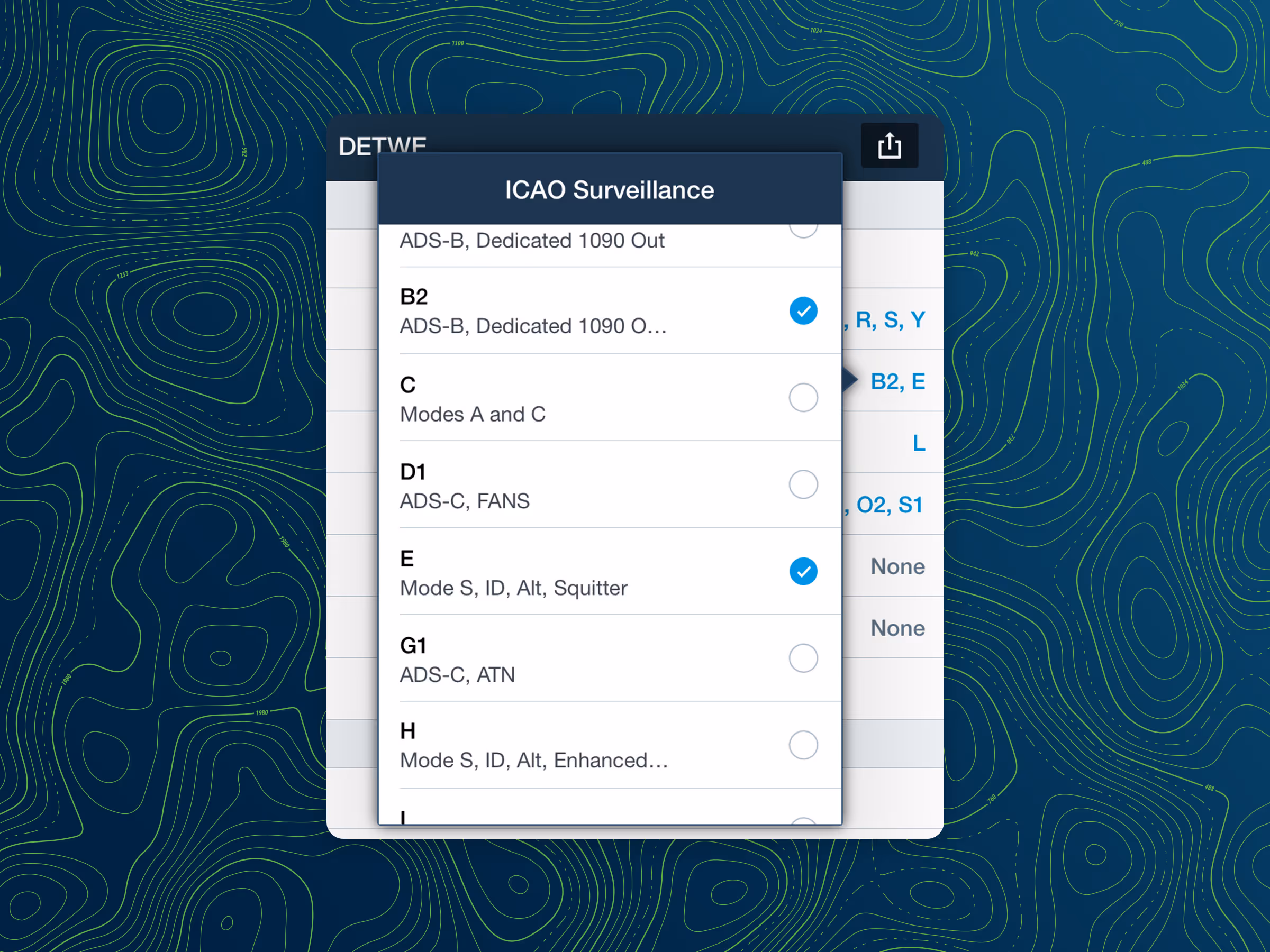 Tippen Sie anschließend auf „ICAO Surveillance“, um den Transpondertyp auszuwählen. Je nach vorhandenem Transponder-Modell sind unterschiedliche Codes möglich. Im ForeFlight Filing Guide finden Sie die Werte für eine Reihe verbreiteter Transponder. Mindestens Typ “S” ist international inzwischen Standard und für die erfolgreiche Flugplanaufgabe nötig.
