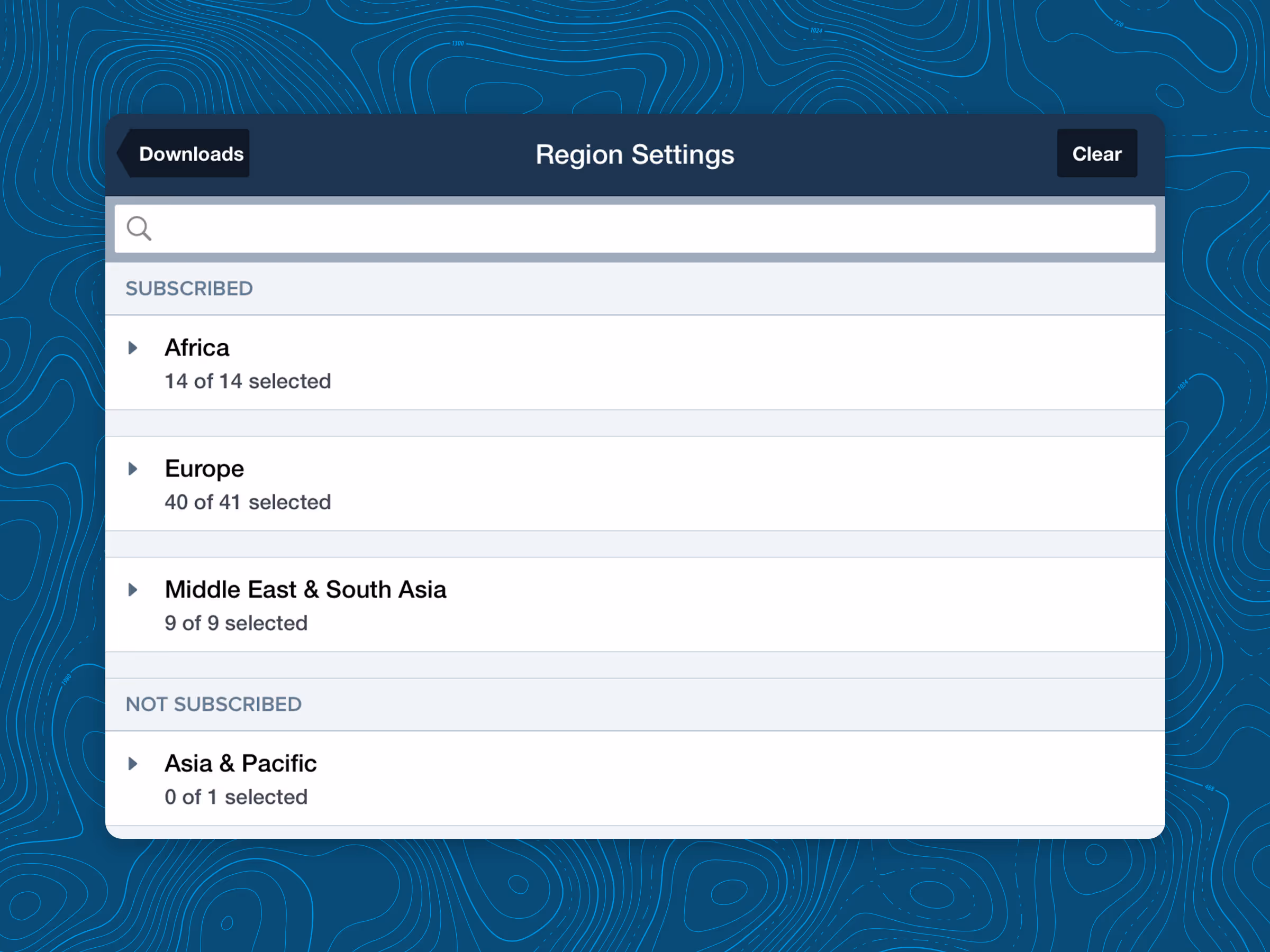 Downloads (Mehr > Downloads) ist Ihre Hauptoberfläche für die Auswahl und Verwaltung der lokal auf Ihrem Gerät gespeicherten Karten und Daten. Die hier getroffene Auswahl wird bei jedem Datenzyklus automatisch aktualisiert. In der Ansicht „Downloads“ können Sie: Kartentypen auswählen (z. B. IFR High / Low Enroute, VFR Sectionals, VNC), die Regionen und Länder auswählen, in denen Sie fliegen (z. B. USA, Europa, Frankreich, Deutschland, U.K., ...), diese Regionen herunterladen und bei jedem Datenzyklus automatische Aktualisierungen erhalten