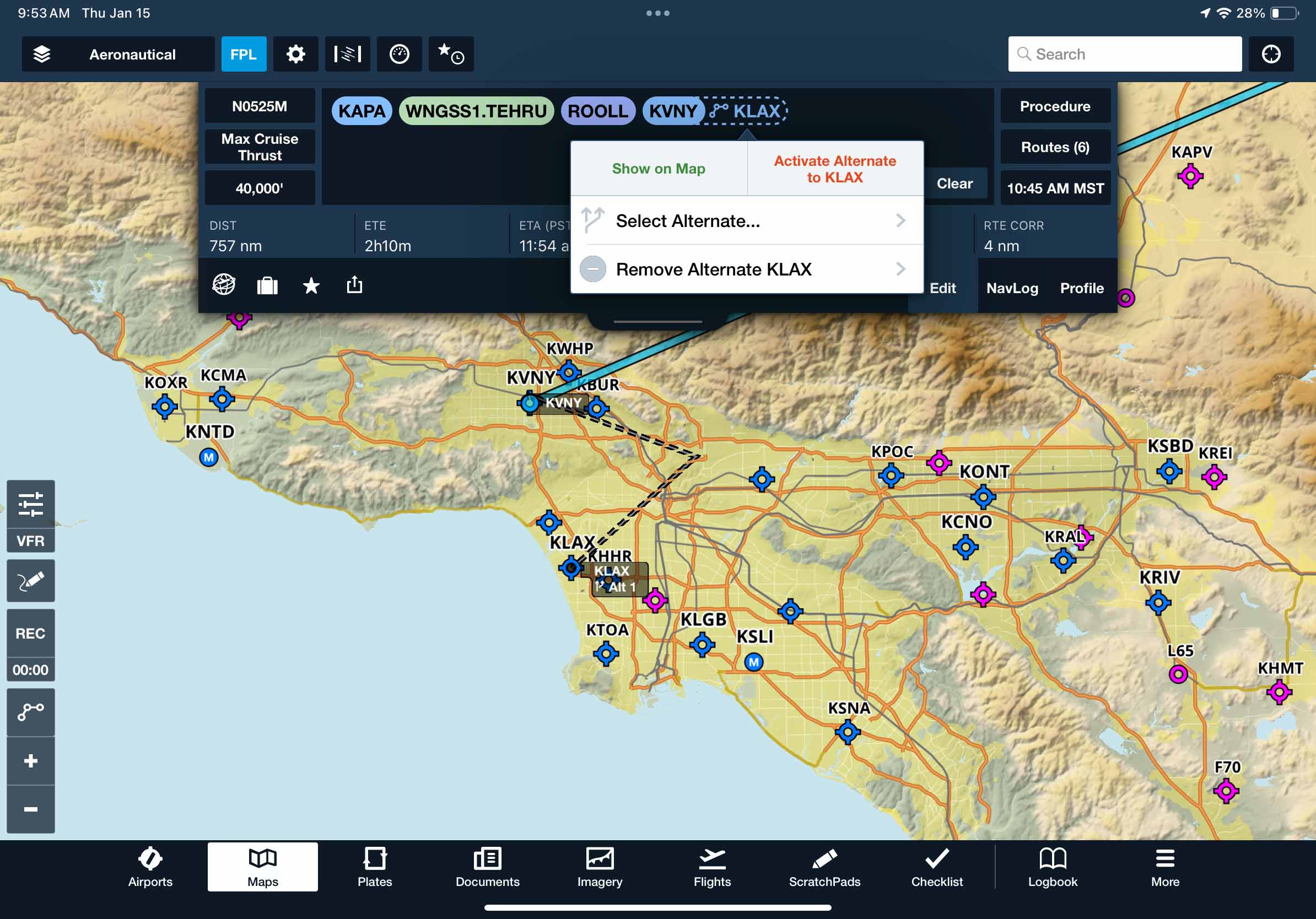 Extend your alternate planning workflow to the Maps view for enhanced situational awareness and faster decision making. Add alternates directly from the FPL editor, by tapping an airport on the map and selecting More >, via Procedure Advisor, or by sending a route with alternates from Flights to Maps. Once added, alternates appear in the FPL editor and on the map, connected by a dashed line, either directly or along a specified route. Tap an alternate bubble to switch airports, modify the path, or instantly activate your route to your alternate.