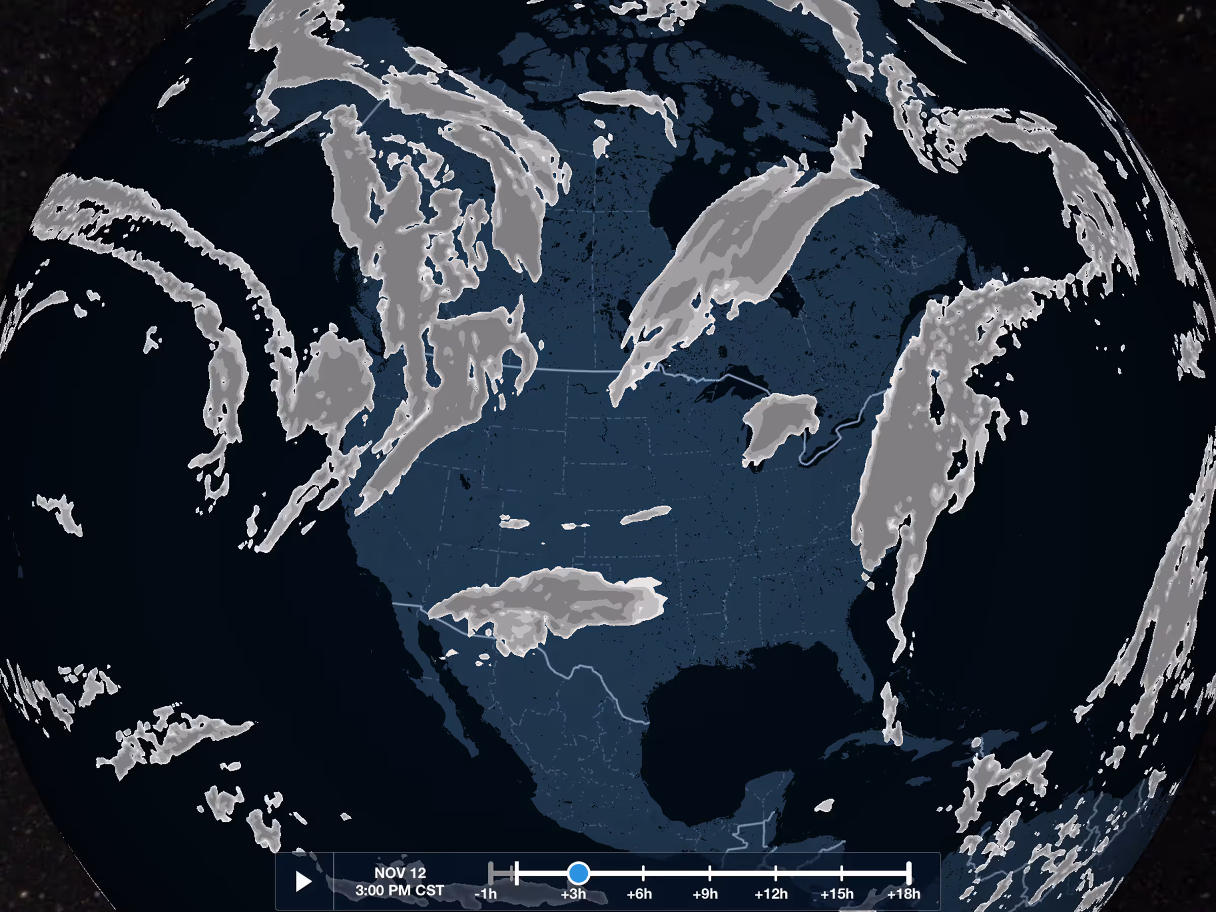 Clouds uses data from the GFS Cloud Coverage product to provide a global 24-hour forecast of cloud coverage and altitudes. Rather than forecasting the actual positions of clouds, this layer depicts the likely extent of cloud coverage over a given area at the specified time and altitude, with each shade of gray roughly corresponding to standard cloud coverage intensities: few, scattered, broken, and overcast.