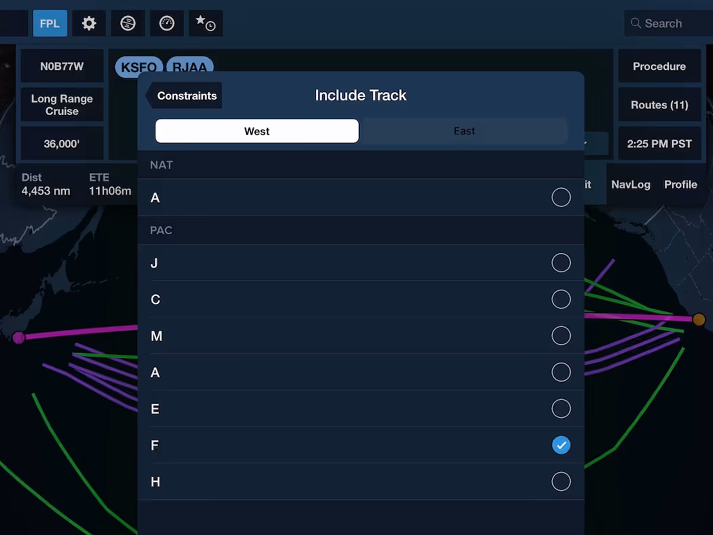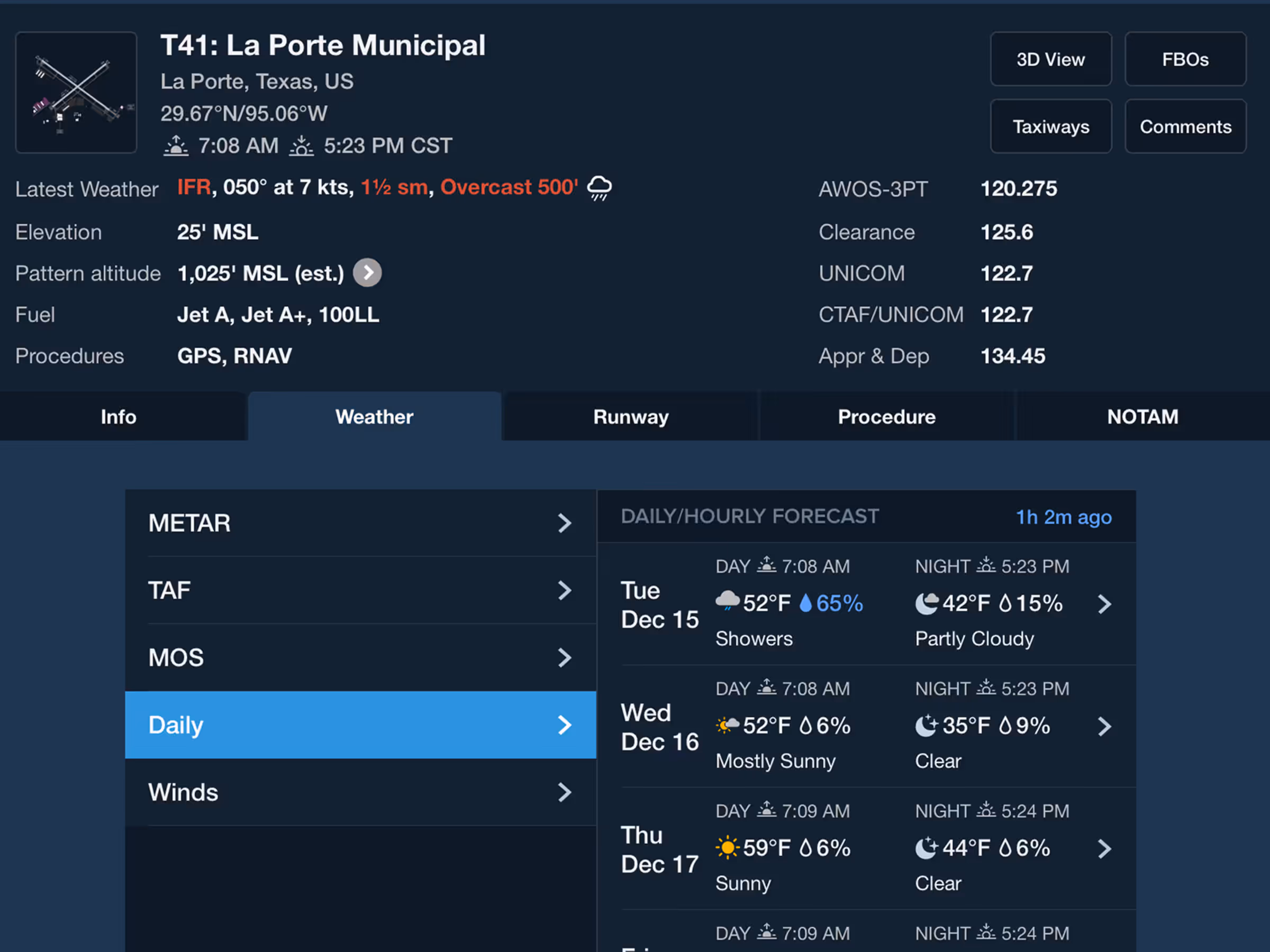 The Forecast window is divided into three rows: Daily Forecasts at the bottom, Hourly Forecasts in the middle, and Hourly Forecast details at the top. The row of Daily Forecasts provides graphical depictions of each day’s general weather, as well as daily temperature ranges. The multi-colored band along the very bottom of this row depicts changes in flight category throughout each day, with green, blue, red, and magenta representing VFR, marginal VFR, IFR, and low IFR, respectively. Tap on any Daily Forecast to automatically scroll to it in Hourly Forecasts and select a morning forecast period.