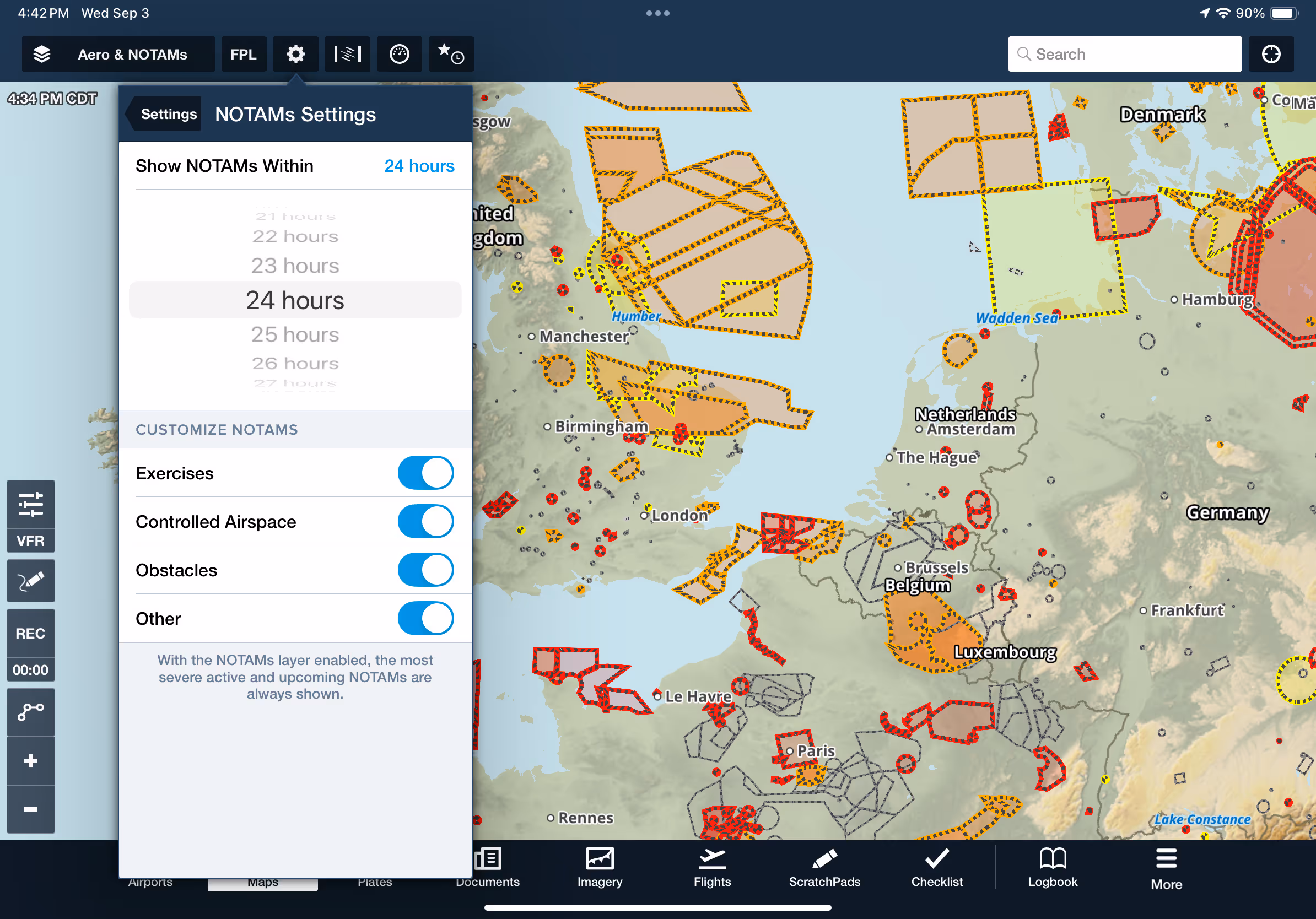 Plan ahead with the option to display Graphical NOTAMs on the Map up to 48 hours before their effective time. With the NOTAMs map layer enabled, go to Map Settings > NOTAMs Settings, then adjust the Show NOTAMs Within setting, and set it to any number of hours between 2 hours (the default setting) and 48 hours.