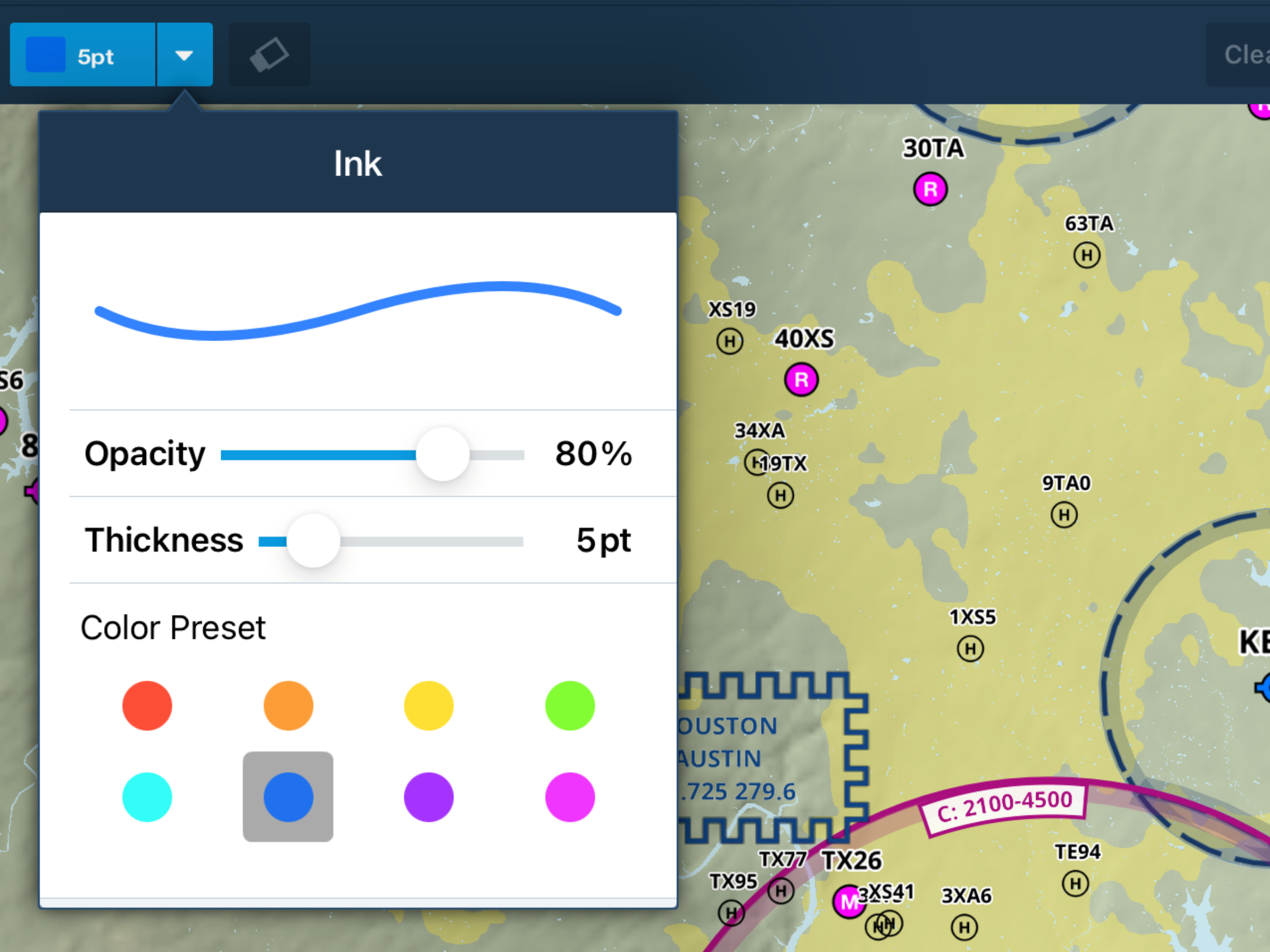 Take notes on the fly using ForeFlight’s Map Annotations feature. Take notes, draw holding patterns, highlight relevant parts of a map or layer, and more. Map Annotations show up over any chart or map layer so you can see your notes above any weather or plates.