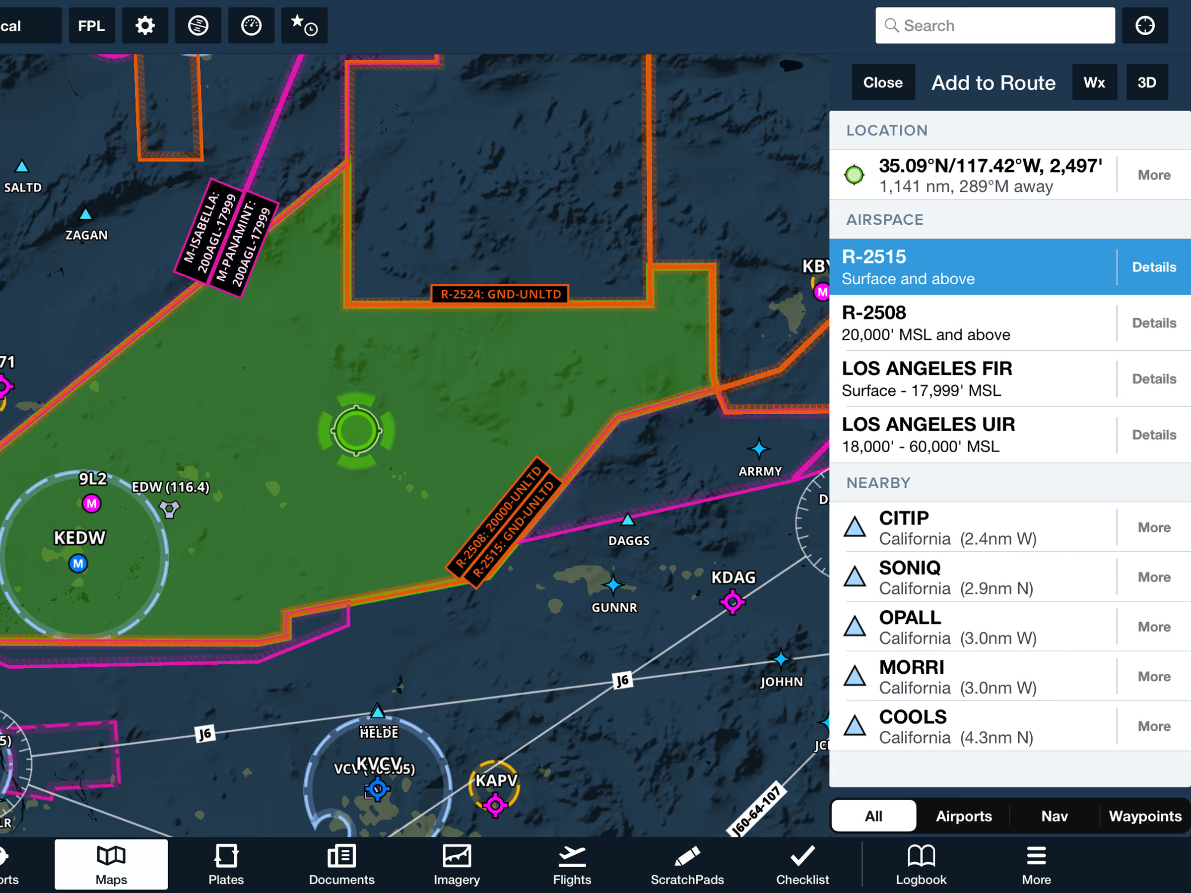 ForeFlight also displays a flashing green marker on the selected map element or location where you tapped so you don’t lose track of it, and highlights any airspace at that location in green. Tapping on an airway or route leg will outline such segments in green rather than displaying the point marker.
