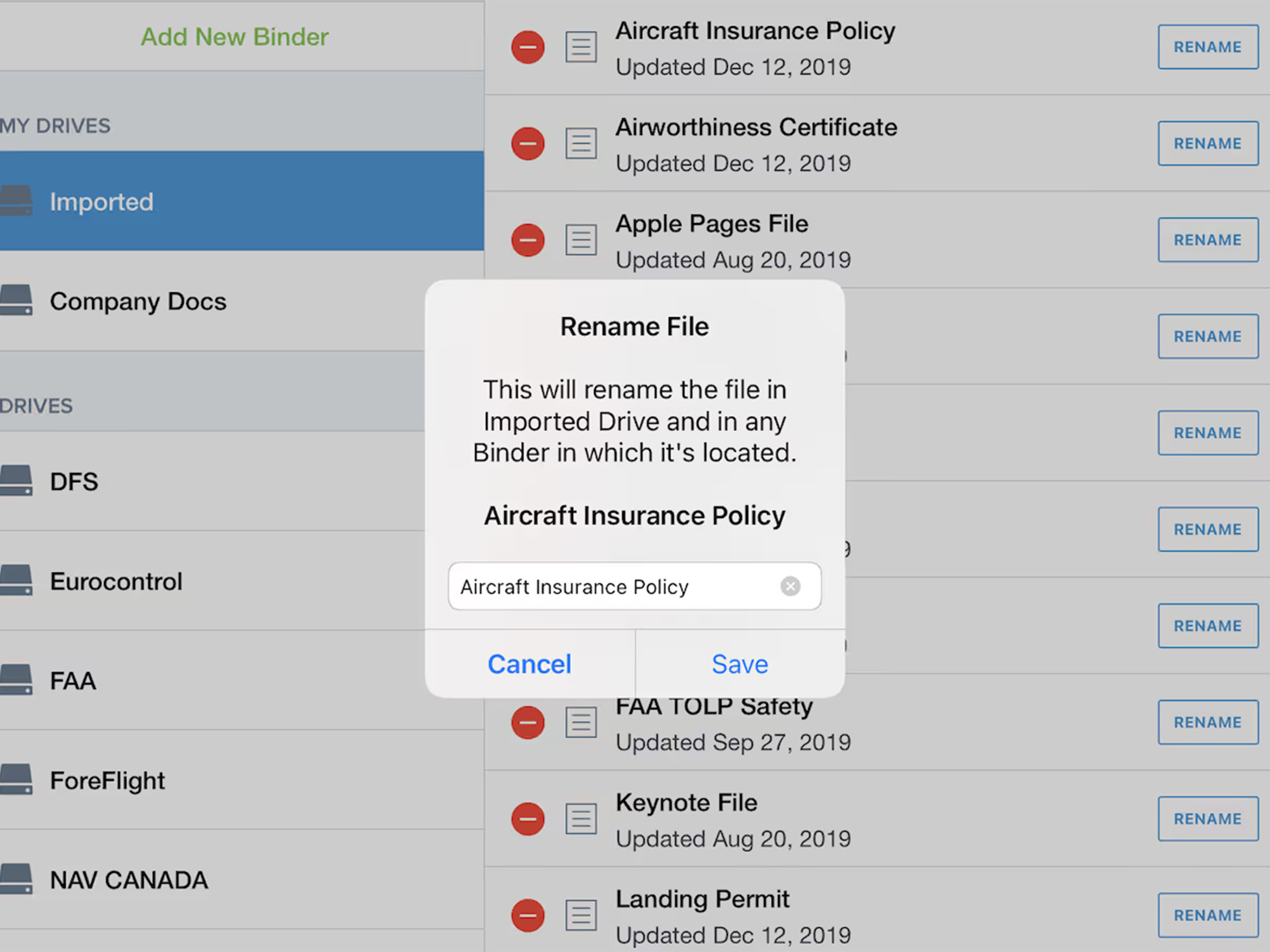 Only documents in the Imported drive support renaming, including documents that you’ve added to binders from the Imported drive. Documents in built-in drives (e.g. ForeFlight, FAA, etc.) and Cloud Document drives cannot be renamed.