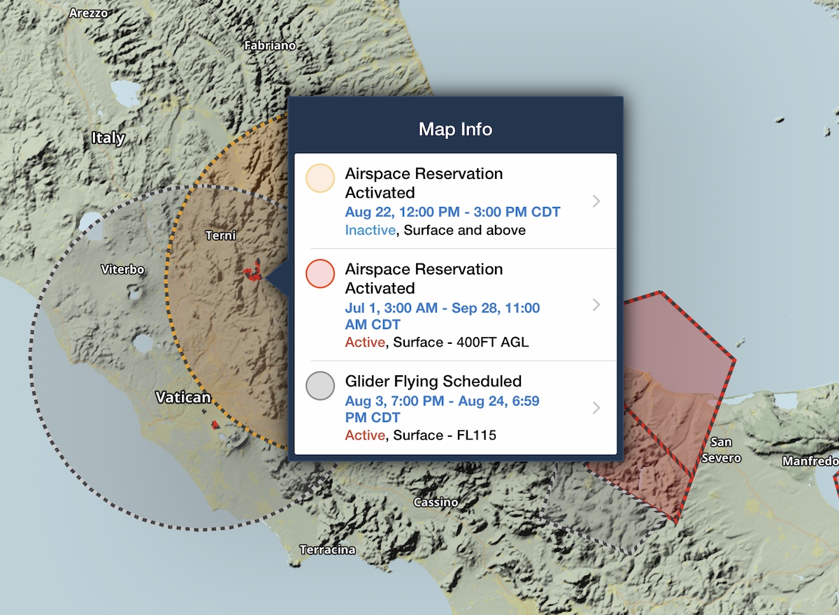 Access graphical depictions of European enroute NOTAMs directly on ForeFlight’s map as part of the NOTAMs/TFRs map layer. ForeFlight uses geographic data contained in NOTAM descriptions to draw their actual shapes whenever possible, and color-codes NOTAMs gray, orange, or red based on increasing severity and type. Tap on each NOTAM to view its description and active times.