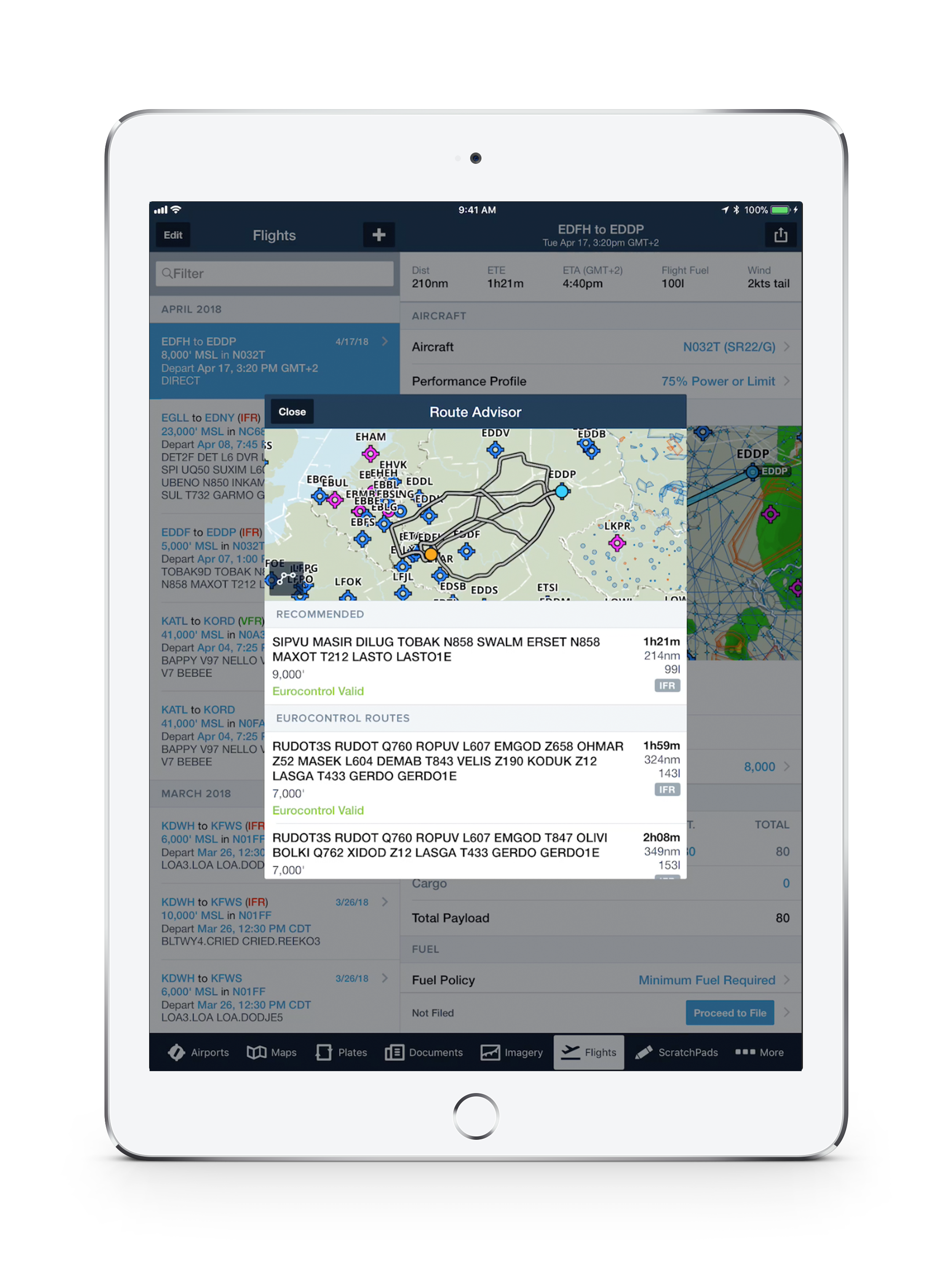 ForeFlight's powerful routing engine generates EUROCONTROL validated options in a matter of seconds. The Graphical Route Advisor feature makes it easy to preview, compare, and select your route.