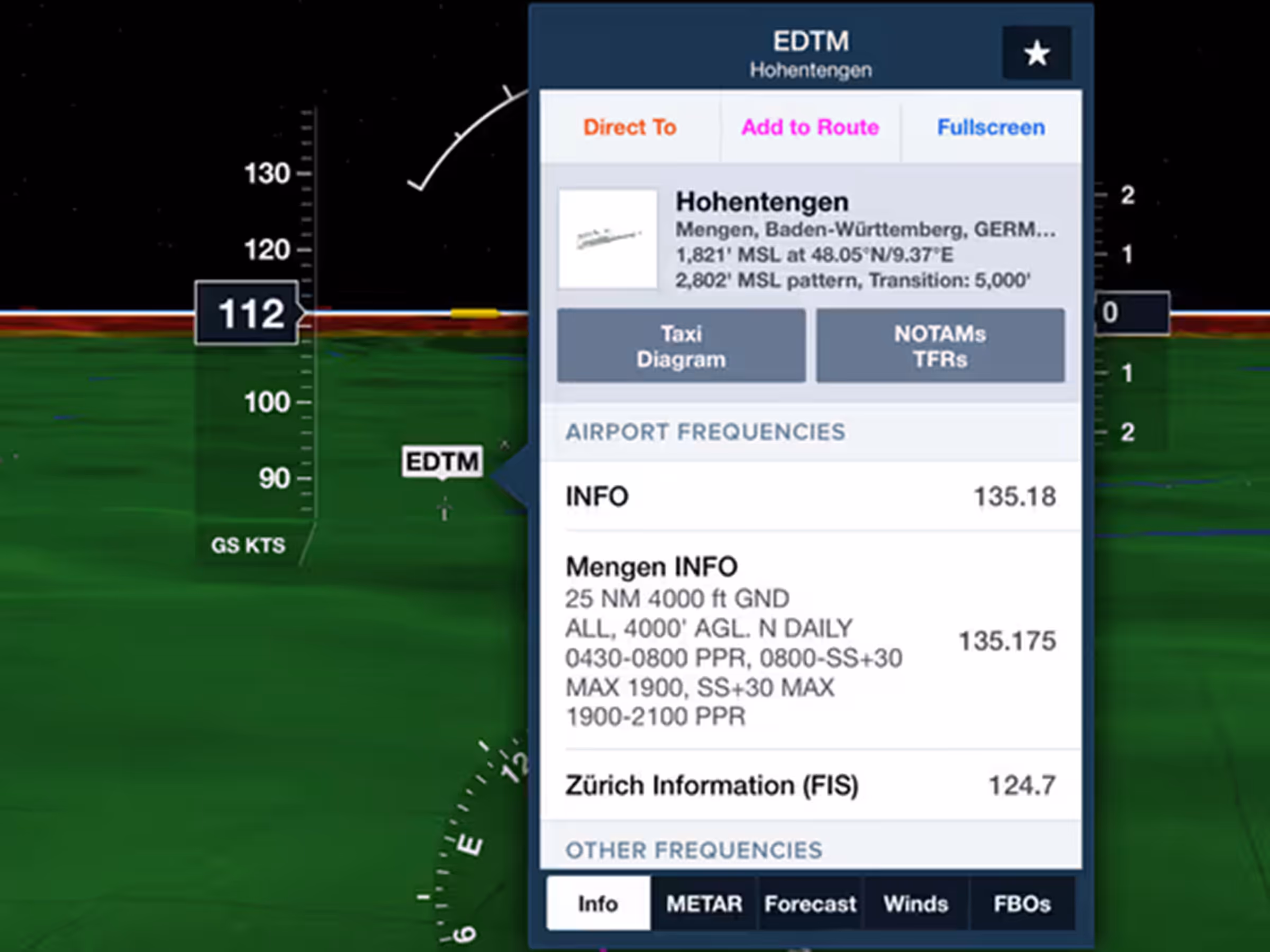 - Airport markers in Synthetic Vision are larger for better visibility and you can also single-tap on them to access the information popover just like on the Aeronautical Map layer.