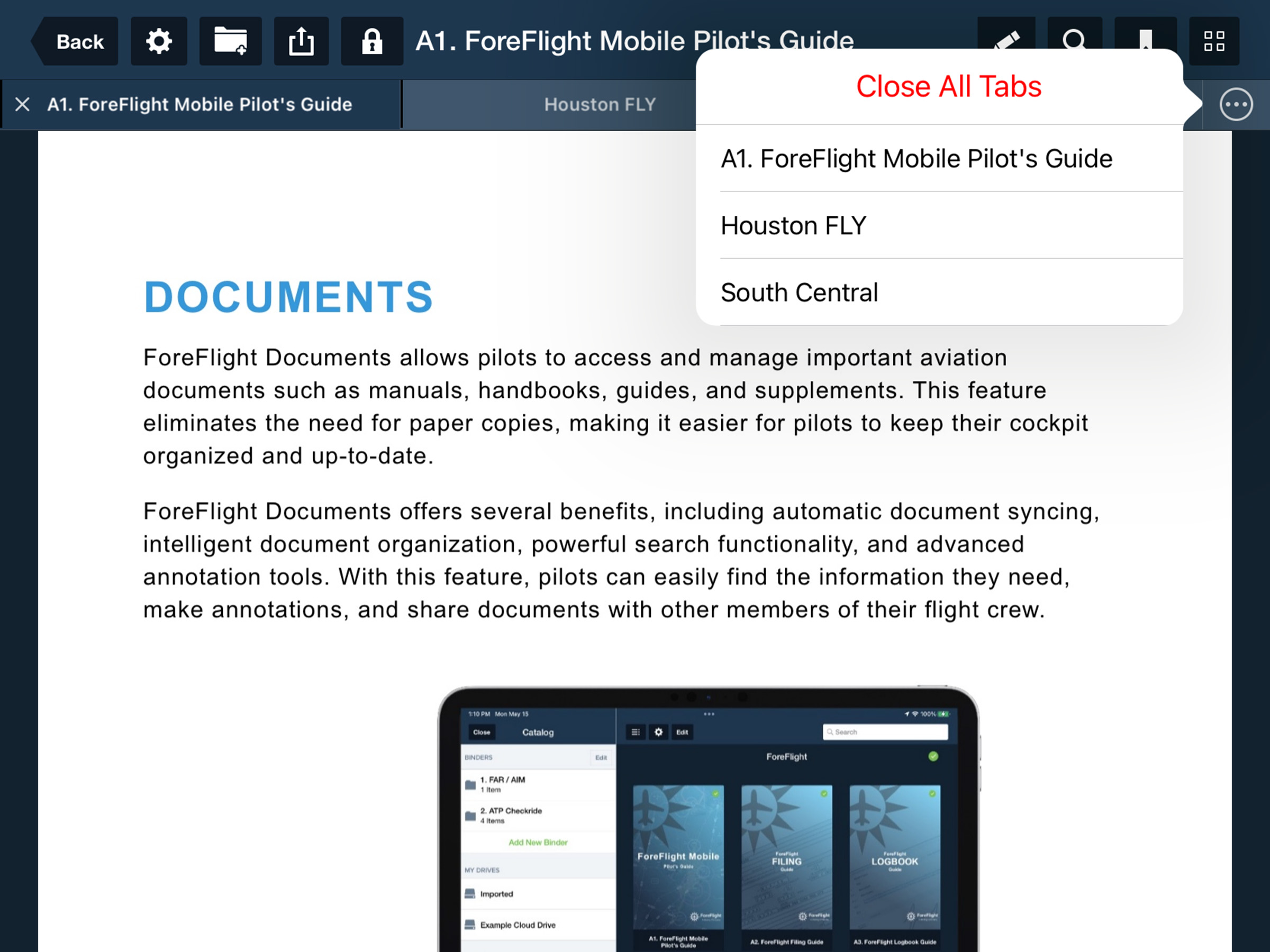 - Opening any document will automatically open it as a new tab alongside any existing tabs, which appear in a bar along the top of the document viewer. Tap on other tabs to switch between them, and tap the X button on the left side of the current tab to close it.
