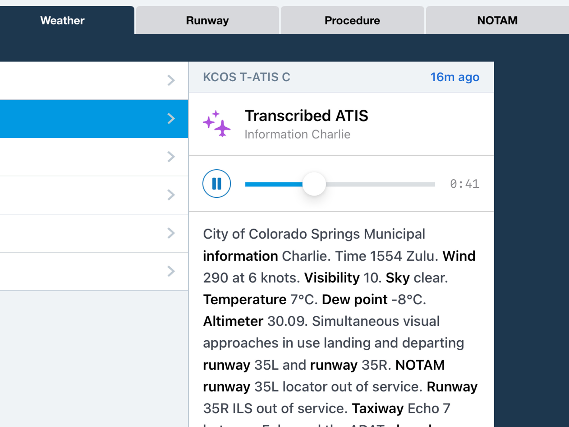 - When T-ATIS is available for a given airport it appears in Airports > Weather > ATIS with the broadcast’s alphanumeric identifier and the time since the information became effective. Key terms in the transcribed text are bolded to make it easier to scan and retain.