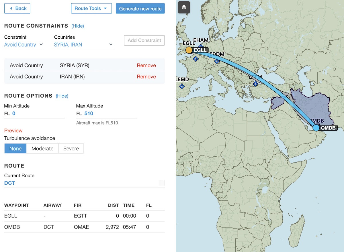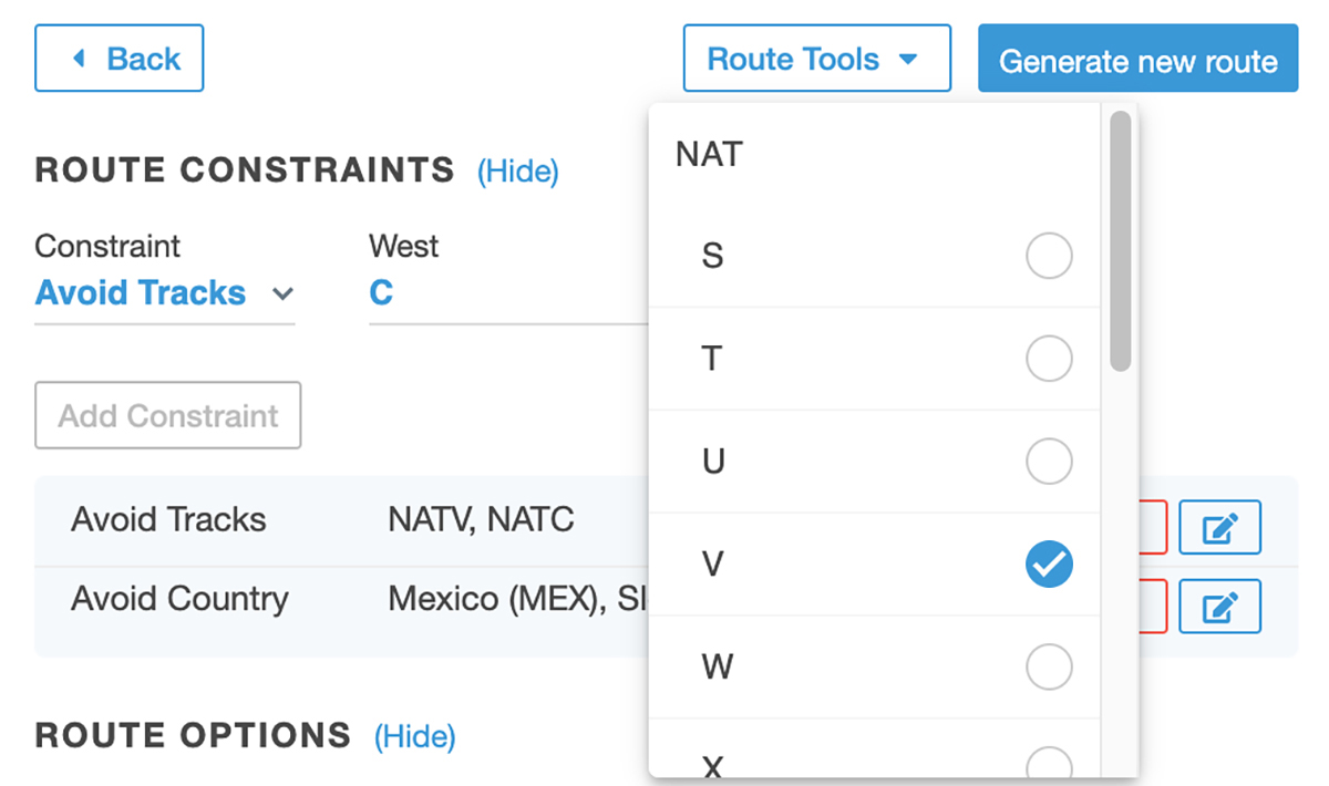 Use Route Constraints to avoid airspace when generating a route in Dispatch, giving you greater flexibility to tailor routes to your needs. Choose an airspace type and then scroll or search through a list of airspaces to avoid.