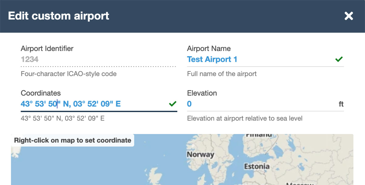 Dispatch allows you to create new user airports and manage them from the Flights or Settings pages. Every custom airport is defined simply by a unique four-letter identifier, a name, and a set of lat/long coordinates. When you file a flight plan to or from a custom airport, Dispatch automatically provides the airport's coordinates and name in the proper fields of the ICAO filing form, allowing you to file the flight plan as easily as you would with known airports. Learn more here. - Map Improvements