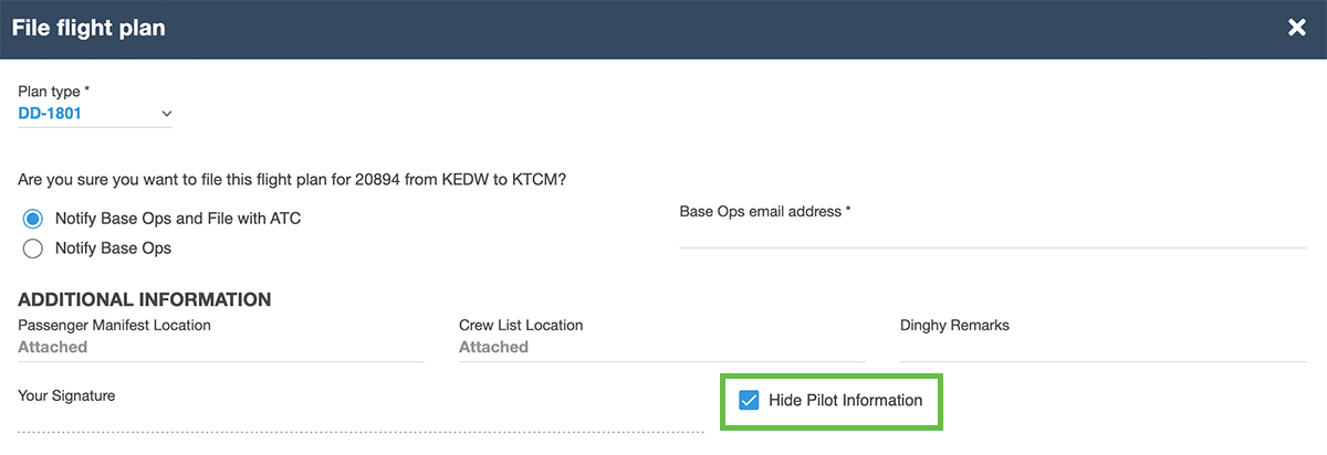 Pilots and flight planners now have the flexibility to manage pilot name visibility on filed DD-1801 forms with the 'Hide Pilot Information' checkbox available in the File Flight Plan form. With this option selected, the PIC section on the DD-1801 form is populated with "ON FILE", and the signature block is left blank.