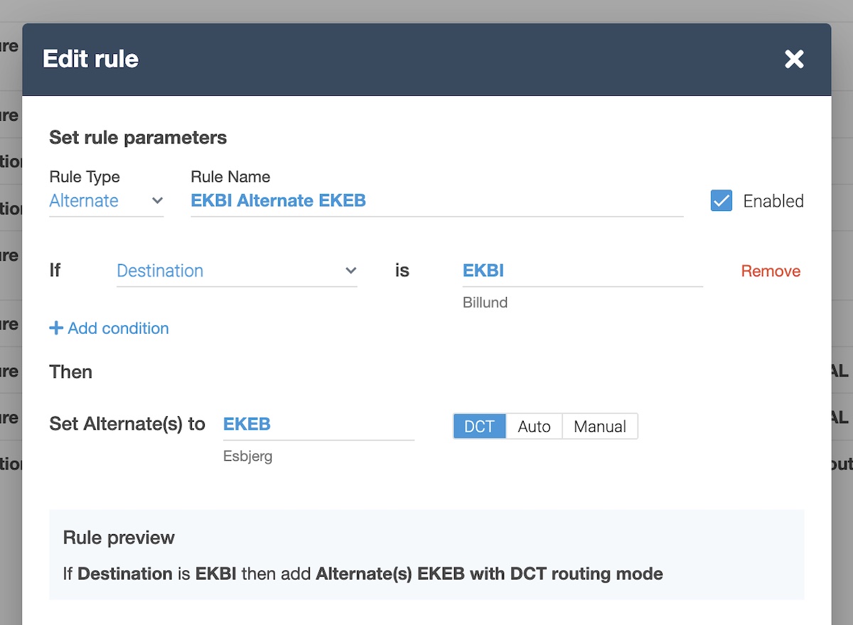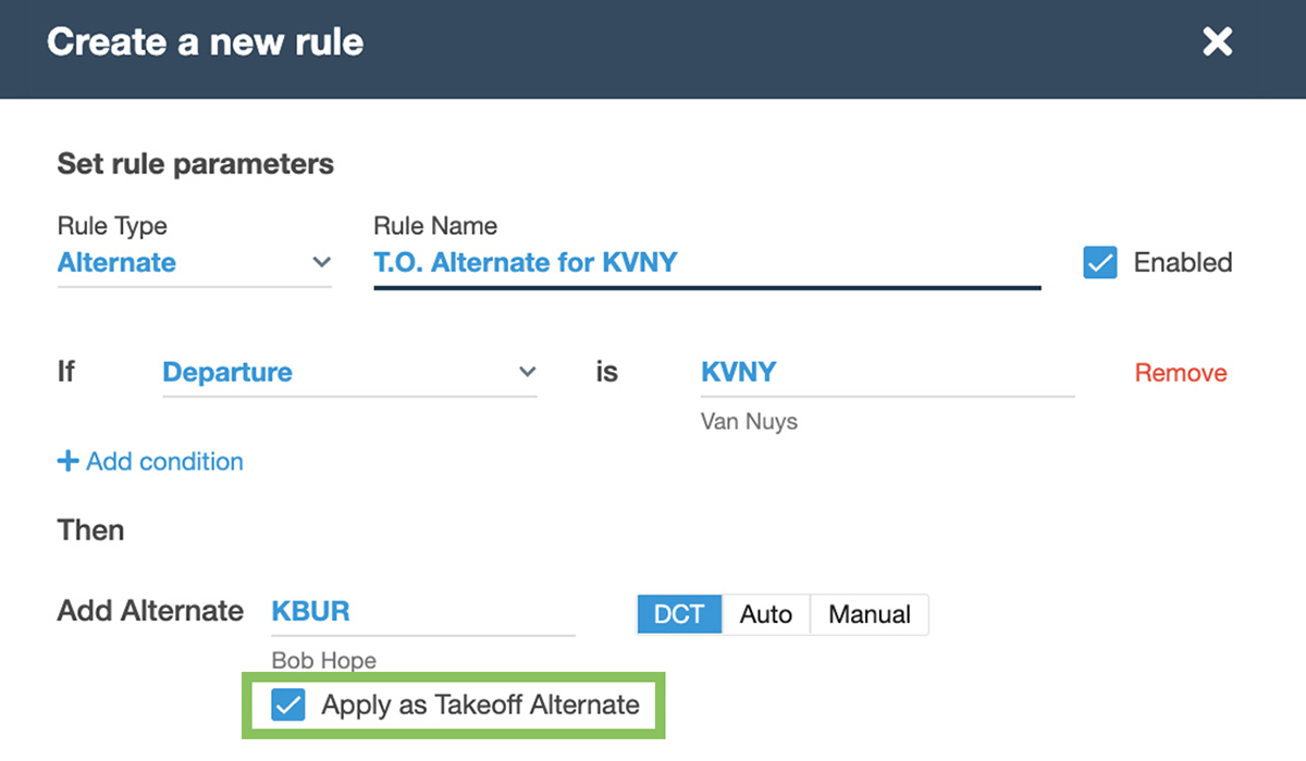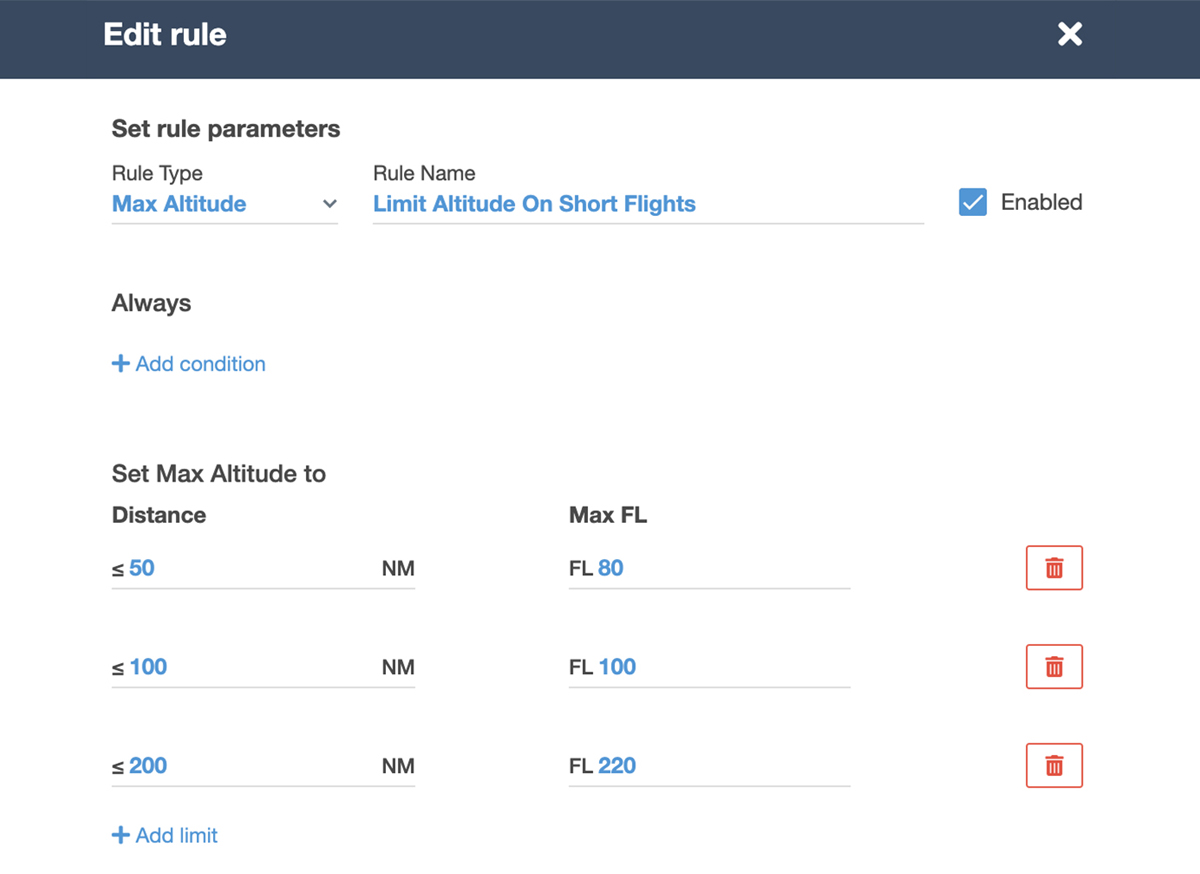 The user interface for adding and editing Operational Rules in Dispatch now more clearly defines the available parameters and logical operations, and provides a plain-language preview of the rule for added clarity. - Preview Features & Turbulence Avoidance