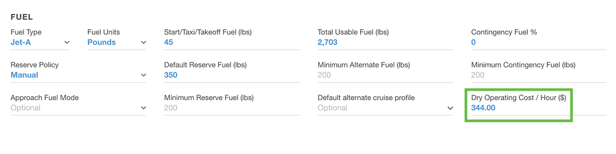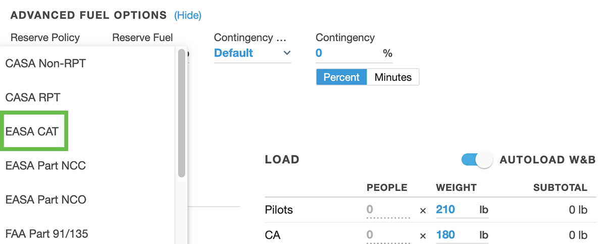 Adjust your contingency fuel percentages in the Advanced Fuel Options section of a flight plan.