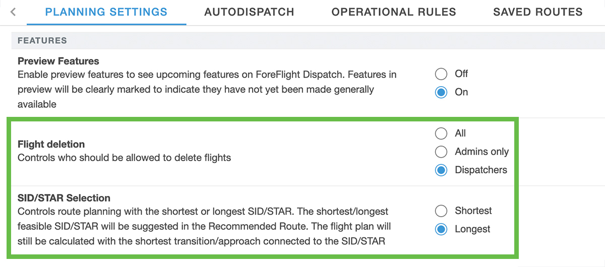 You are now able to restrict who can delete flights using the Flight Deletion setting in Settings > Planning Settings. Leave it as the default “All” setting to match current behavior , select “Admins Only” to limit deletion power to designated admins only, or select “Dispatchers” to empower designated dispatchers as well as admins. Remember that you can designate user roles like Admin or Dispatcher for individual users on your account in the Organization tab.