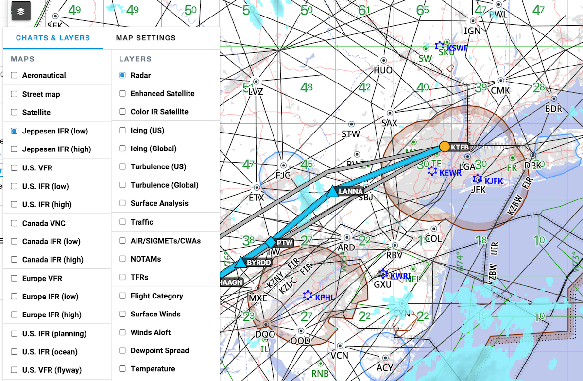 All Dispatch customers can now access Jeppesen Enroute Charts directly on the map in Dispatch and ForeFlight Web, providing easy access to industry-leading enroute charts even if you don’t have an active Jeppesen chart subscription. Click the map layer toggle in the top-left to select Jeppesen’s IFR Low or High enroute charts near the top of the left column. Note that a Jeppesen subscription is still necessary to view Jeppesen terminal charts and Airway Manuals on the Web, as well as any Jeppesen charts in ForeFlight Mobile. - Custom Content: Publishing & Waypoint Elevation