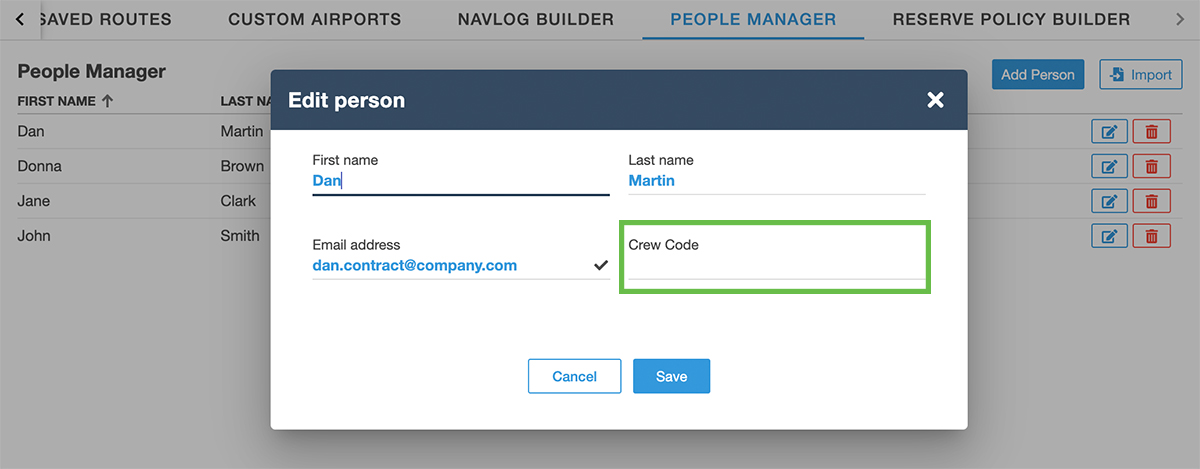 Flight planners can now get better visibility into potential issues thanks to a new warning icon in the Flight List next to a flight’s Edit button that signals errors or warnings related to Weight & Balance (WB), Runway Analysis (RWA), Enroute Performance, or filing. Hovering over the icon provides a brief summary of the issue. - People Manager: Add Crew Code