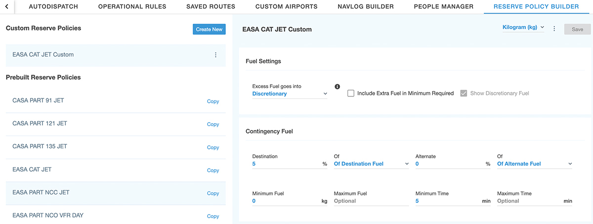 Customize Reserve Fuel Policies to perfectly align with your organization's requirements using the new Reserve Fuel Policy Builder that will soon be found in the Settings menu. Administrators will be able to effortlessly create and manage custom fuel policies, and once a new policy has been added, your pilots will be able to plan their flights using the custom policy. You can also access the builder by clicking on the Fuel Policy dropdown within any flight plan and selecting Manage Custom Fuel Policy. - W&B: Passenger Distribution Curtailment