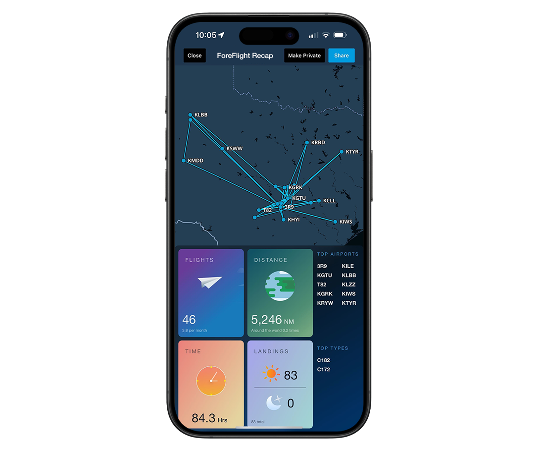 Logbook Recap offers an interactive snapshot of your 2025 flying, drawn straight from your logbook and available directly in the ForeFlight app or on the web. It highlights your total hours, miles, landings, and top destinations, giving you a clear picture of your year in the cockpit.