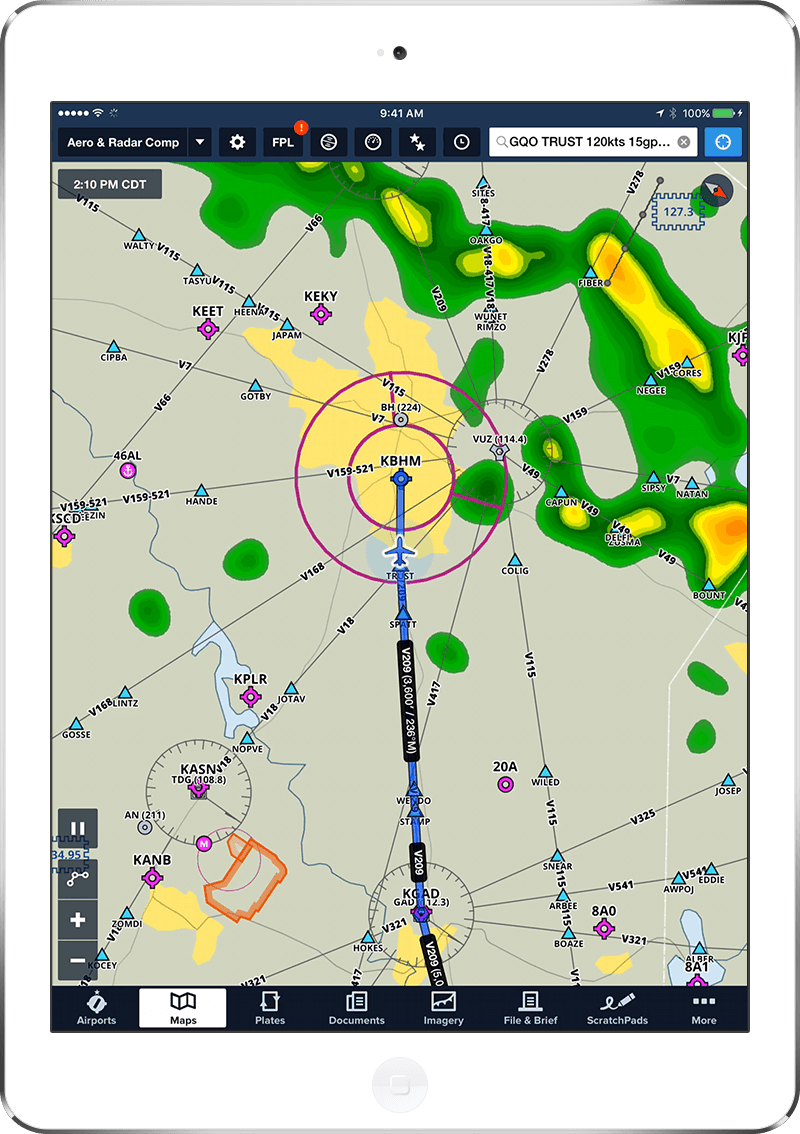 Welcome to the next generation in data-driven map technology. ForeFlight Aeronautical Maps deliver an incredibly beautiful panning and continuous zoom experience. Automatic declutter smoothly renders airspace, airways, navaids, and other map elements. Dynamic ‘always-up’ labels and adjustable text size make everything easier to read. ForeFlight airport diagrams are embedded into the map so you can view runways, taxiways, and FBO locations without switching app views.