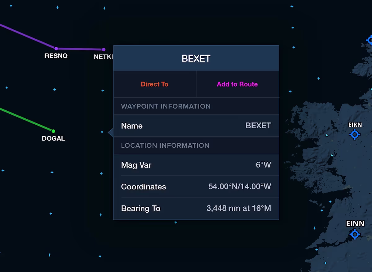 ForeFlight’s Aeronautical Map now displays many types of waypoints not associated with airways, including off-route intersections, oceanic waypoints, and others. The new waypoints are included in both the High and Low Airspace layers in Map Settings > Airways, and appear when either layer is enabled.