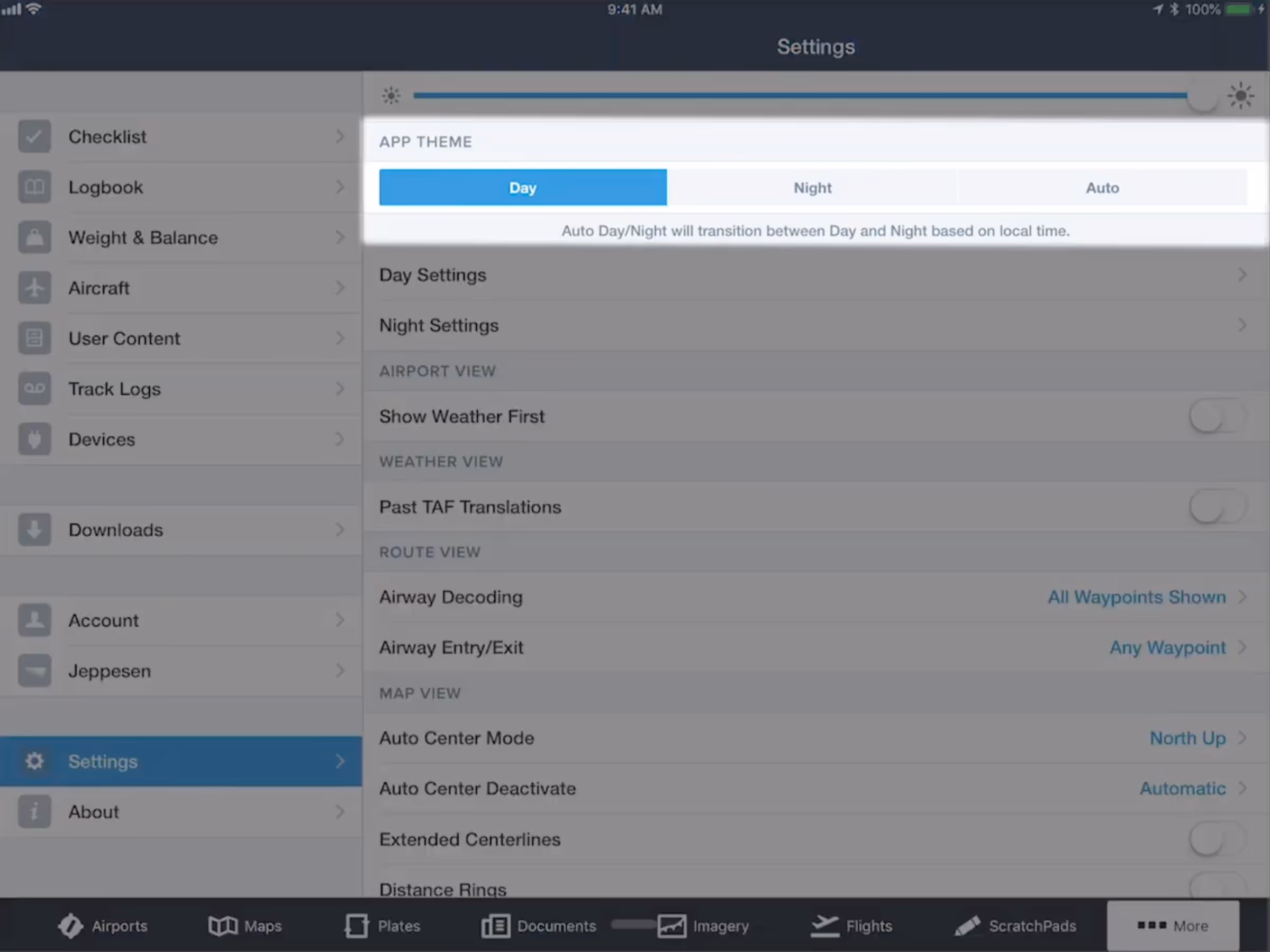 Customizing ForeFlight themes and color inversion settings is now a lot easier. The new theme manager provides you with convenient centralized control over all of the individual theme and color settings throughout the app. Select from Day, Night or with Auto mode, ForeFlight will automatically transition between the Day and Night themes at sunrise and sunset, helping your eyes adjust to changing light levels with no app interaction needed.