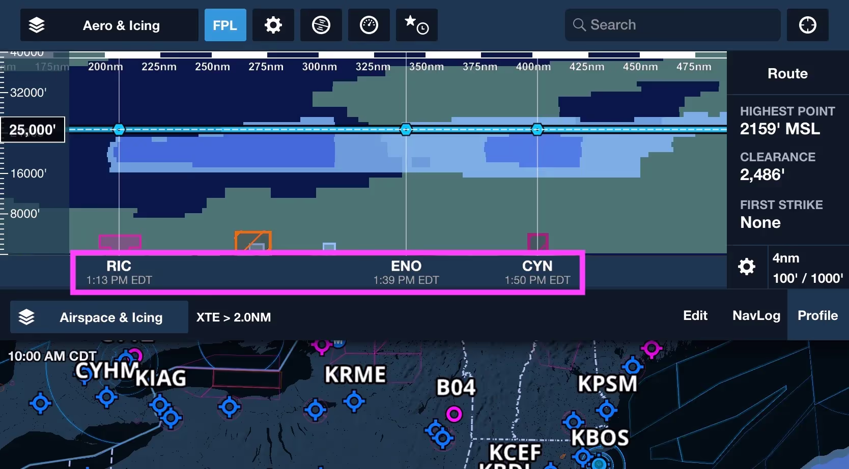 Rather than using a time slider to show different forecast periods like the overhead map, Profile View combines any forecast periods that will be active during your flight into one seamless display. The waypoint markers in Profile View include estimated crossing times, allowing you to easily determine the forecast period shown at each waypoint and view the same forecast on the overhead map. Changing the selected aircraft or performance profile will display different icing and turbulence data in Profile view based on the route’s new enroute time.